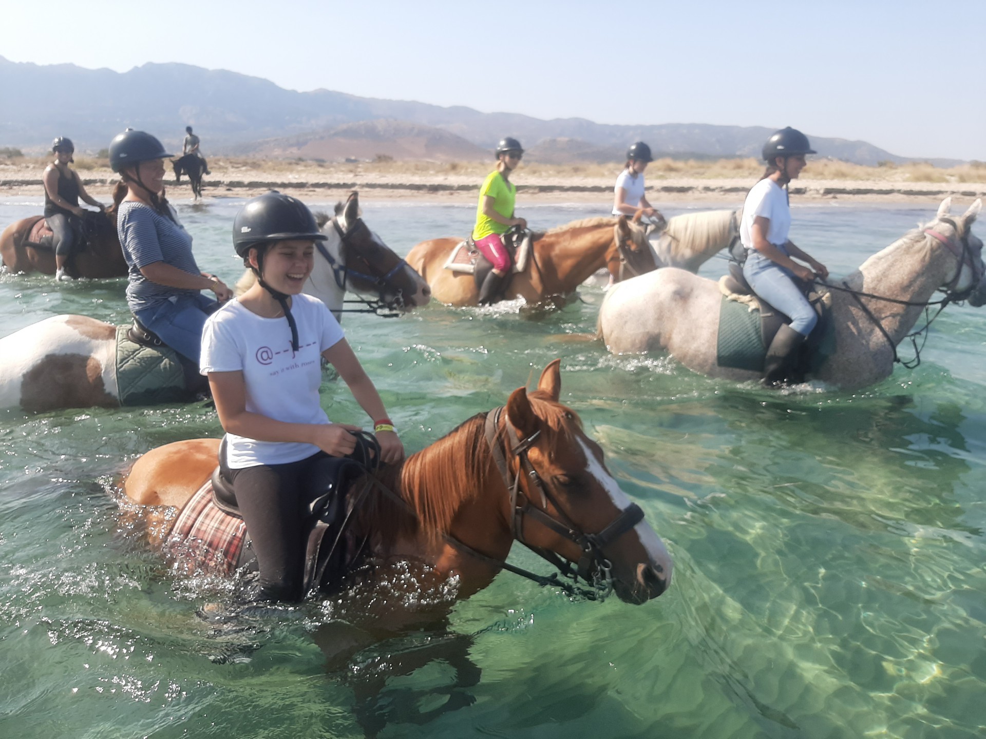 We start our ride always from our stables and make our way through the fields and dirt roads to get to the Salt Lake. This is where we will take in the scenery of the flamingos that live on the Salt Lake most of the year and with the open stretch of path, we can canter around the Salt Lake to get to the best beach on Kos. Down at the beach you will be blown away by the breathtaking views of the beach and nearby islands. And of course go for a dip in the sea with our beautiful horses.